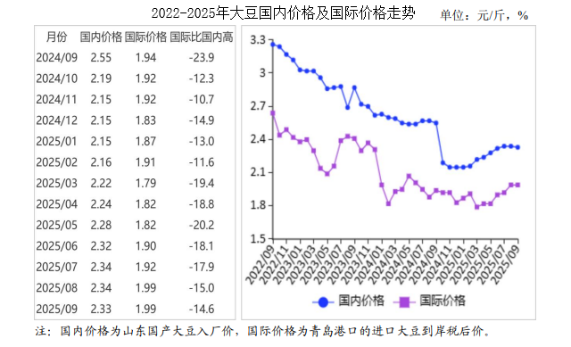 東北產(chǎn)區(qū)近期天氣狀況良好,新季大豆收獲范圍不斷擴(kuò)大,上市量逐步增加,水分與蛋白指標(biāo)較上市初期明顯改善。江蘇、山東、河南、安徽等產(chǎn)區(qū)也有新豆零星上市,但受前期干旱影響,整體品質(zhì)略低,盡管近期出現(xiàn)降雨,但對早熟品種質(zhì)量提升有限。各地集中收割預(yù)計在9月底陸續(xù)展開,10月10日后進(jìn)入高峰期。當(dāng)前農(nóng)戶普遍存在惜售心理,貿(mào)易商收購態(tài)度謹(jǐn)慎,食品加工企業(yè)整體備貨水平也低于往年,國產(chǎn)大豆價格總體保持平穩(wěn)。9月份,黑龍江國產(chǎn)食用大豆平均收購價每斤2.04元,環(huán)比持平,同比跌12.6%;山東國產(chǎn)大豆入廠價每斤2.33元,環(huán)比跌0.6%,同比跌8.6%;大連商品交易所豆一(非轉(zhuǎn)基因大豆)主力合約(2025年11月)收盤價每斤1.97元,環(huán)比跌3.0%,同比跌7.5%。