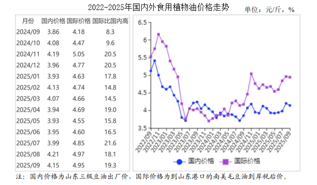 9月份,9%關(guān)稅下的加拿大油菜籽到我國口岸的稅后價格每斤2.27元,比國內(nèi)油菜籽入廠價每斤低0.37元,價差比上月擴(kuò)大0.19元;美國墨西哥灣豆油離岸價每噸1135美元,折人民幣每斤4.04元,比國內(nèi)銷區(qū)豆油價格低0.12元,價差比上月縮小0.04元;天津口岸的進(jìn)口豆油稅后價每斤4.95元,比當(dāng)?shù)貒a(chǎn)豆油出廠價每斤高0.80元,價差比上月擴(kuò)大0.04元。