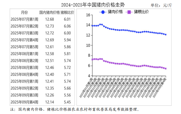 中商情報網(wǎng)訊:2025年9月,生豬和豬肉價格繼續(xù)下跌。受二季度以來全國新生仔豬數(shù)量持續(xù)增加影響,生豬出欄進入全年高峰期,供給將繼續(xù)增長。11月份開始南方地區(qū)將陸續(xù)腌制臘肉,豬肉消費需求季節(jié)性增長,價格有望季節(jié)性回升,總體窄幅波動。