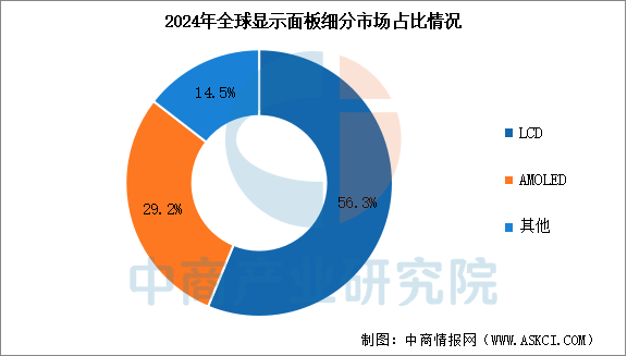 中商產(chǎn)業(yè)研究院發(fā)布的《2025-2030年中國新型顯示產(chǎn)業(yè)市場調(diào)研及行業(yè)投資格局預測報告》顯示,目前顯示面板行業(yè)由LCD及AMOLED兩大顯示技術主導。其中,LCD顯示面板市場份額約為56.3%,AMOLED顯示市場份額約為29.2%。