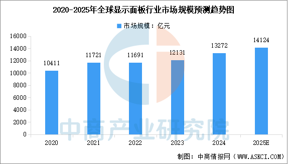 在顯示技術持續(xù)創(chuàng)新,應用領域進一步拓展以及智能終端產(chǎn)品加速滲透的共同驅(qū)動下,全球顯示面板行業(yè)步入快速發(fā)展階段。中商產(chǎn)業(yè)研究院發(fā)布的《2025-2030全球及中國顯示面板市場現(xiàn)狀研究分析與發(fā)展前景預測報告》顯示,2020-2024年全球顯示面板行業(yè)市場規(guī)模從10411億元增長至13272億元,年均復合增長率達6.3%。中商產(chǎn)業(yè)研究院分析師預測,2025年全球顯示面板行業(yè)市場規(guī)模將達到14124億元。