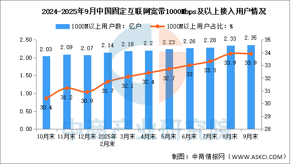 截至9月末,三家基礎(chǔ)電信企業(yè)的固定互聯(lián)網(wǎng)寬帶接入用戶總數(shù)達(dá)6.95億戶,比上年末凈增2486萬戶。其中,100Mbps及以上接入速率的固定互聯(lián)網(wǎng)寬帶接入用戶達(dá)6.61億戶,占總用戶數(shù)的95.2%;1000Mbps及以上接入速率的固定互聯(lián)網(wǎng)寬帶接入用戶達(dá)2.35億戶,比上年末凈增2839萬戶,占總用戶數(shù)的33.9%,占比較上年末提升3個(gè)百分點(diǎn)。