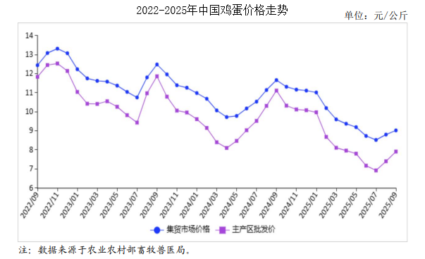 中商情報網(wǎng)訊:2025年9月,雞蛋價格連續(xù)2個月上漲。全國在產(chǎn)蛋雞存欄處于高位,雞蛋市場供應(yīng)有保障。隨著節(jié)日效應(yīng)消退,雞蛋消費缺乏利好因素提振,預(yù)計后期雞蛋價格小幅下跌。