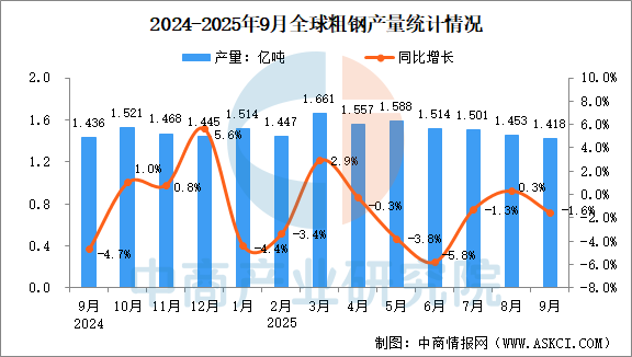 中商情報網(wǎng)訊:2025年9月全球70個納入世界鋼鐵協(xié)會統(tǒng)計國家/地區(qū)的粗鋼產(chǎn)量為1.418億噸,同比提高1.6%;1-9月累計產(chǎn)量為13.738億噸,同比下降1.6%。