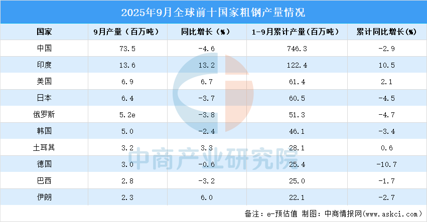 2025年9月,中國粗鋼產(chǎn)量為7349萬噸,同比下降4.6%;印度粗鋼產(chǎn)量為1360萬噸,同比提高13.2%;美國粗鋼產(chǎn)量為690萬噸,同比提高6.7%;日本粗鋼產(chǎn)量為640萬噸,同比下降3.7%;俄羅斯粗鋼預(yù)估產(chǎn)量為520萬噸,同比下降3.8%;韓國粗鋼產(chǎn)量為500萬噸,同比下降2.4%;土耳其粗鋼產(chǎn)量為320萬噸,同比提高3.3%;德國粗鋼產(chǎn)量為300萬噸,同比下降0.6%;巴西粗鋼產(chǎn)量為280萬噸,同比下降3.2%;伊朗粗鋼產(chǎn)量為230萬噸,同比提高6.0%。