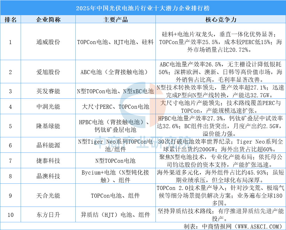 通威股份憑借硅料與電池片的垂直一體化優(yōu)勢穩(wěn)居龍頭,而愛旭股份、英發(fā)睿能等專業(yè)電池廠商則通過深耕ABC、TOPCon等N型技術(shù)路線,以領先量產(chǎn)效率搶占高端市場。行業(yè)已全面從P型轉(zhuǎn)向N型技術(shù),TOPCon產(chǎn)能預計占據(jù)全球總產(chǎn)能的83%,BC背接觸及HJT異質(zhì)結(jié)成為差異化競爭焦點。