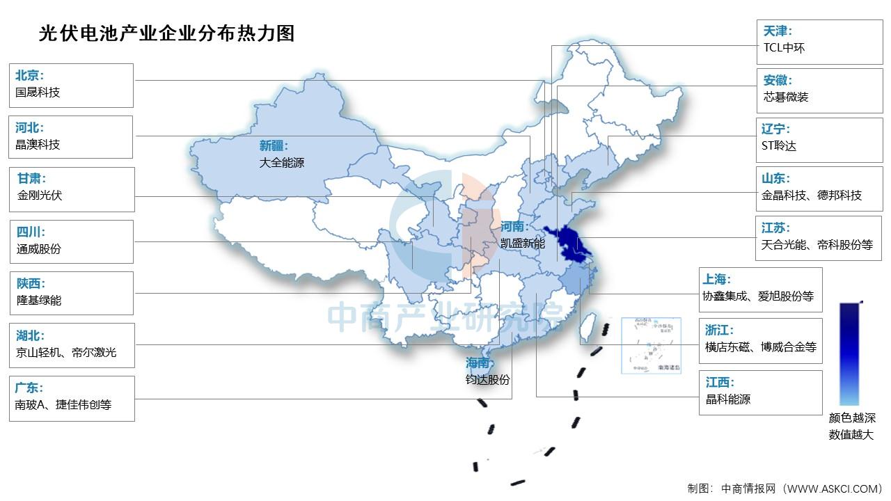 目前,光伏電池相關(guān)上市企業(yè)主要分布在江蘇省,共20家。浙江省有6家,排名第二。廣東省和上海市均為4家,并列第三。