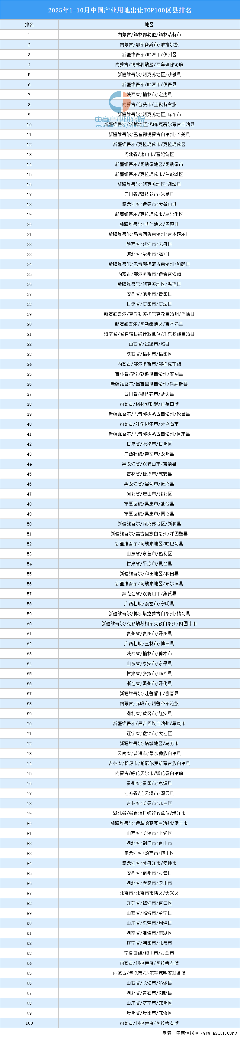 據(jù)中商產(chǎn)業(yè)研究院產(chǎn)業(yè)地產(chǎn)情報(bào)庫(kù)監(jiān)測(cè)數(shù)據(jù)顯示:2025年1-10月全國(guó)產(chǎn)業(yè)用地出讓TOP100區(qū)(縣)排行榜已揭曉。據(jù)榜單顯示,2025年1-10月我國(guó)產(chǎn)業(yè)用地出讓面積前十區(qū)縣分別為:內(nèi)蒙古/錫林郭勒盟/錫林浩特市、內(nèi)蒙古/鄂爾多斯市/準(zhǔn)格爾旗、新疆維吾爾/哈密市/伊州區(qū)、內(nèi)蒙古/錫林郭勒盟/西烏珠穆沁旗、新疆維吾爾/阿克蘇地區(qū)/沙雅縣、新疆維吾爾/哈密市/伊吾縣、陜西省/榆林市/定邊縣、內(nèi)蒙古/包頭市/土默特右旗、新疆維吾爾/阿克蘇地區(qū)/庫(kù)車(chē)市、新疆維吾爾/塔城地區(qū)/和布克賽爾蒙古自治縣。