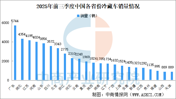 2025年前三季度廣東和湖北冷藏車銷量位列前二,銷量分別為5744輛、4354輛,同比分別增長30.40%和46.25%。江蘇、河南銷量超4000輛,分別為4195輛、4024輛。天津和江西同比增長迅速,分別增長172.7%和114.26%。