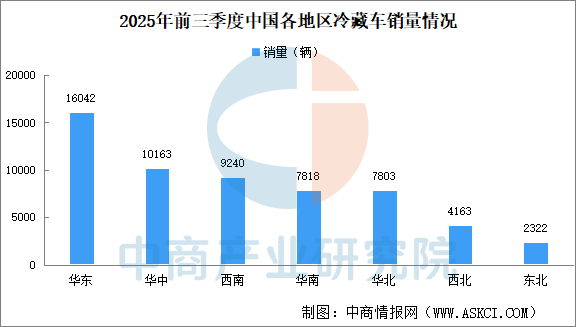 從銷售區(qū)域來看,2025年前三季度華東地區(qū)領跑全國冷藏車市場,為1.60萬輛,占比為27.9%。華中和西南地區(qū)緊隨其后,銷量分別為1.02萬輛和9240輛,占比分別為17.7%和16.1%。華南地區(qū)、華北地區(qū)、西北地區(qū)、東北地區(qū)銷量分別為7818萬輛、7803萬輛、4163萬輛、2322萬輛,占比分別為13.6%、13.6%、7.2%、4.0%。