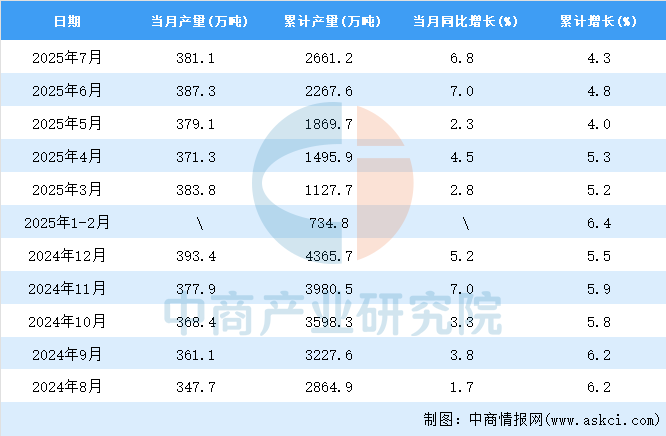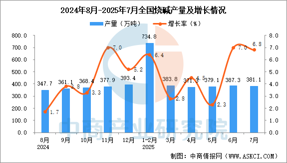 中商情報網(wǎng)訊:據(jù)中商產(chǎn)業(yè)研究院數(shù)據(jù)庫,2025年7月全國燒堿(折100%)當月產(chǎn)量與去年同期相比增長。2025年7月全國燒堿產(chǎn)量為381.1萬噸,同比增長6.8%。2025年1-7月全國燒堿產(chǎn)量2661.2萬噸,同比增長4.3%。