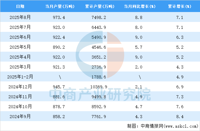 中商情報網訊:據中商產業(yè)研究院數據庫,2025年8月全國硫酸當月產量與去年同期相比增長。2025年8月全國硫酸產量為973.4萬噸,同比增長8.8%。2025年1-8月全國硫酸產量為7498.2萬噸,同比增長7.1%。
