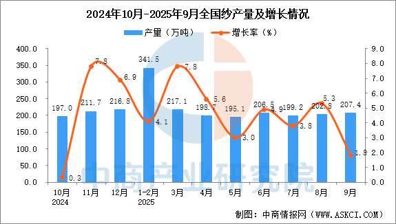2025年9月全國紗產(chǎn)量增長情況