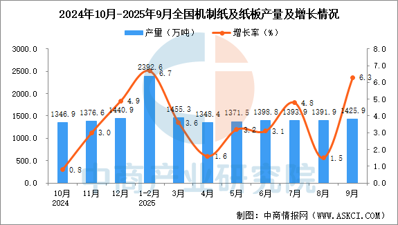 2025年9月全國機制紙及紙板產(chǎn)量增長情況