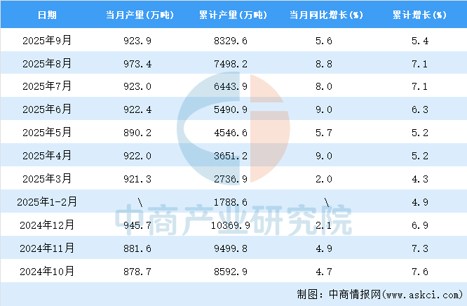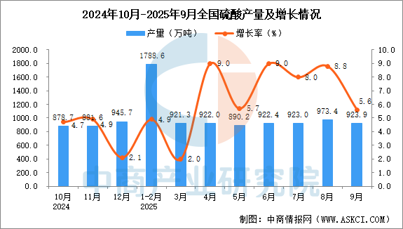 中商情報網(wǎng)訊:據(jù)中商產(chǎn)業(yè)研究院數(shù)據(jù)庫,2025年9月全國硫酸當月產(chǎn)量與去年同期相比增長。2025年9月全國硫酸產(chǎn)量為923.9萬噸,同比增長5.6%。2025年1-9月全國硫酸產(chǎn)量為8329.6萬噸,同比增長5.4%。