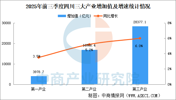中商情報網(wǎng)訊:前三季度四川省經(jīng)濟(jì)運(yùn)行平穩(wěn)、穩(wěn)中提質(zhì)。根據(jù)地區(qū)生產(chǎn)總值統(tǒng)一核算結(jié)果,2025年前三季度四川地區(qū)生產(chǎn)總值為49322.2億元,按不變價格計算,同比增長5.5%。分產(chǎn)業(yè)看,第一產(chǎn)業(yè)增加值3978.7億元,同比增長3.5%;第二產(chǎn)業(yè)增加值16966.4億元,增長5.2%;第三產(chǎn)業(yè)增加值28377.1億元,增長6.0%。