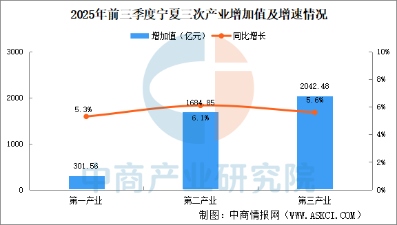 中商情報(bào)網(wǎng)訊:前三季度,寧夏經(jīng)濟(jì)保持良好發(fā)展態(tài)勢(shì)。根據(jù)地區(qū)生產(chǎn)總值統(tǒng)一核算結(jié)果,2025年前三季度,全區(qū)生產(chǎn)總值4028.89億元,按不變價(jià)格計(jì)算,同比增長(zhǎng)5.8%。分產(chǎn)業(yè)看,第一產(chǎn)業(yè)增加值301.56億元,增長(zhǎng)5.3%;第二產(chǎn)業(yè)增加值1684.85億元,增長(zhǎng)6.1%;第三產(chǎn)業(yè)增加值2042.48億元,增長(zhǎng)5.6%。
