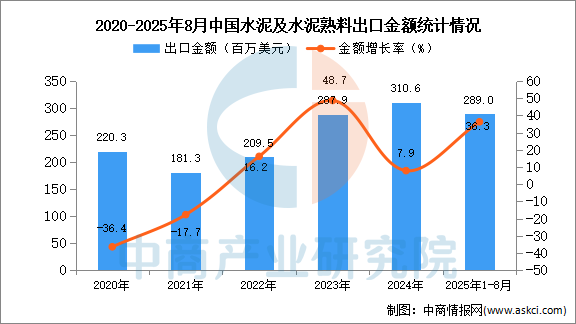 2025年8月中國水泥及水泥熟料出口量及金額增長情況