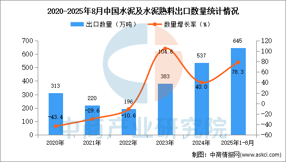 中商情報網(wǎng)訊:據(jù)中商產(chǎn)業(yè)研究院數(shù)據(jù)庫顯示,2024年我國水泥及水泥熟料的出口量537萬噸,同比增長40%。最新數(shù)據(jù)顯示,2025年1-8月中國水泥及水泥熟料出口量645萬噸,同比增長78.3%。