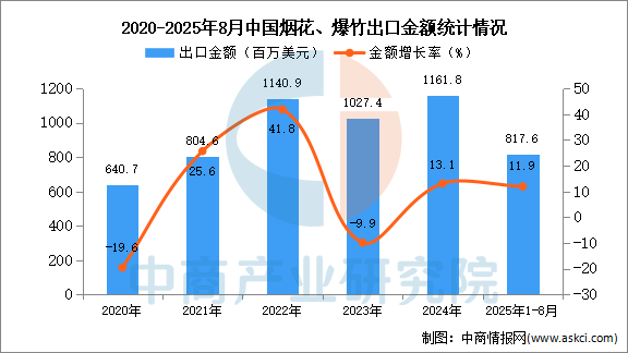 從金額方面來看,數(shù)據(jù)顯示,2025年1-8月中國煙花、爆竹出口金額817.6百萬美元,同比增長11.9%。
