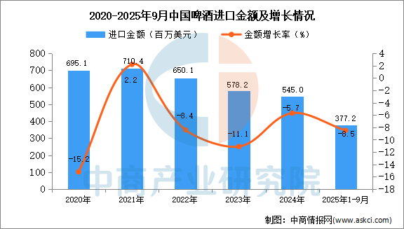 從金額方面來看,數(shù)據(jù)顯示,2025年1-9月中國啤酒進口金額377.2百萬美元,同比下降8.5%。