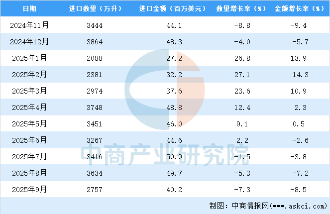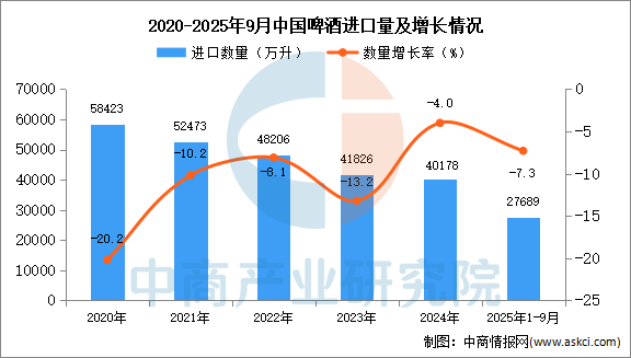 中商情報網(wǎng)訊:據(jù)中商產(chǎn)業(yè)研究院數(shù)據(jù)庫顯示,近幾年,我國啤酒進口量呈下降趨勢,2024年中國啤酒進口量40178萬升,同比下降4%。最新數(shù)據(jù)顯示,2025年1-9月中國啤酒進口量27689萬升,同比下降7.3%。