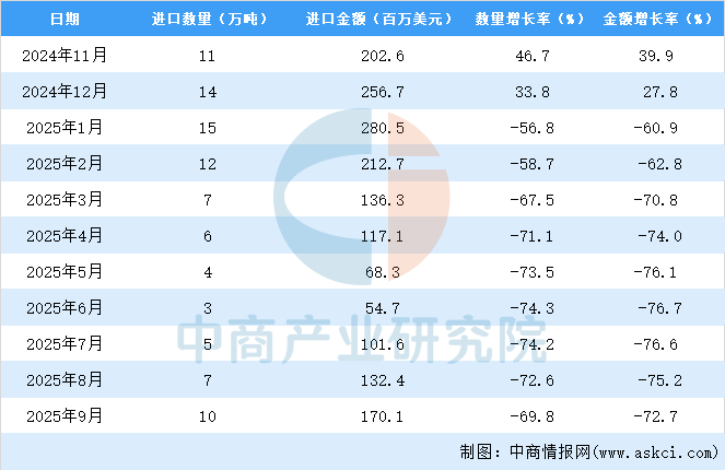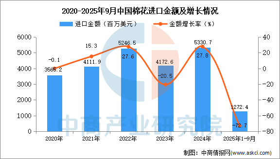 2025年9月中國棉花進(jìn)口量及金額增長情況