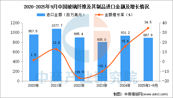 從金額方面來看,數(shù)據(jù)顯示,2025年1-9月中國玻璃纖維及其制品進(jìn)口金額887.9百萬美元,同比增長34.5%。