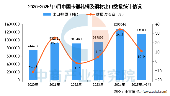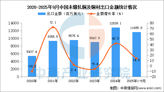 2025年9月中國未鍛軋銅及銅材出口量及金額增長情況