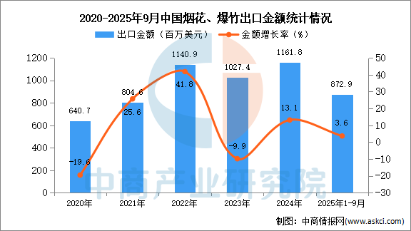2025年9月中國(guó)煙花、爆竹出口量及金額增長(zhǎng)情況