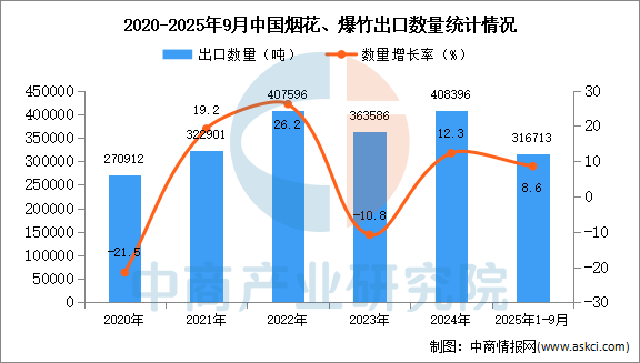2025年1-9月中國(guó)煙花、爆竹出口數(shù)據(jù)統(tǒng)計(jì)分析:出口量同比增長(zhǎng)8.6%