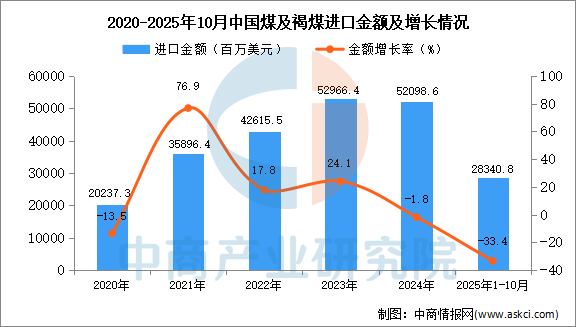 從金額方面來看,數(shù)據顯示,2025年1-10月中國煤及褐煤進口金額28340.8百萬美元,同比下降33.4%。