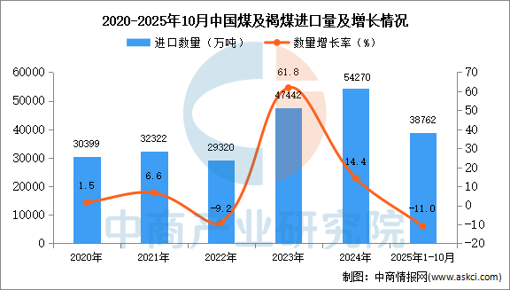 2025年1-10月中國煤及褐煤進口數(shù)據統(tǒng)計分析:進口量38762萬噸