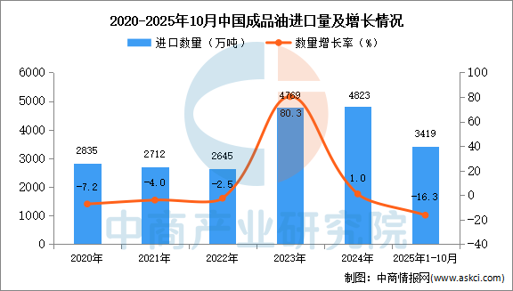 中商情報網(wǎng)訊:據(jù)中商產(chǎn)業(yè)研究院數(shù)據(jù)庫顯示,2024年中國成品油進口量4823萬噸,同比增長1%。最新數(shù)據(jù)顯示,2025年1-10月中國成品油進口量3419萬噸,同比下降16.3%。