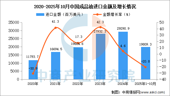 從金額方面來看,數(shù)據(jù)顯示,2025年1-10月中國成品油進口金額19809.3百萬美元,同比下降20.8%。