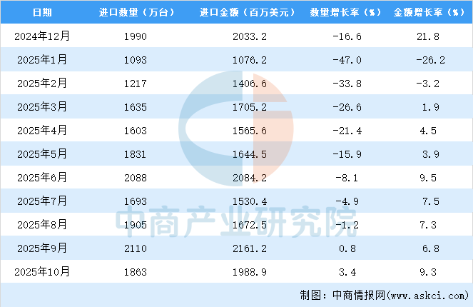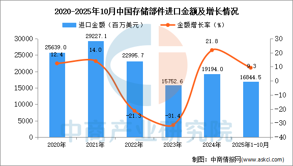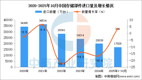 中商情報網(wǎng)訊:據(jù)中商產(chǎn)業(yè)研究院數(shù)據(jù)庫顯示,2024年中國存儲部件進口量20039萬臺,同比下降16.6%。最新數(shù)據(jù)顯示,2025年1-10月中國存儲部件進口量17028萬臺,同比增長3.4%。