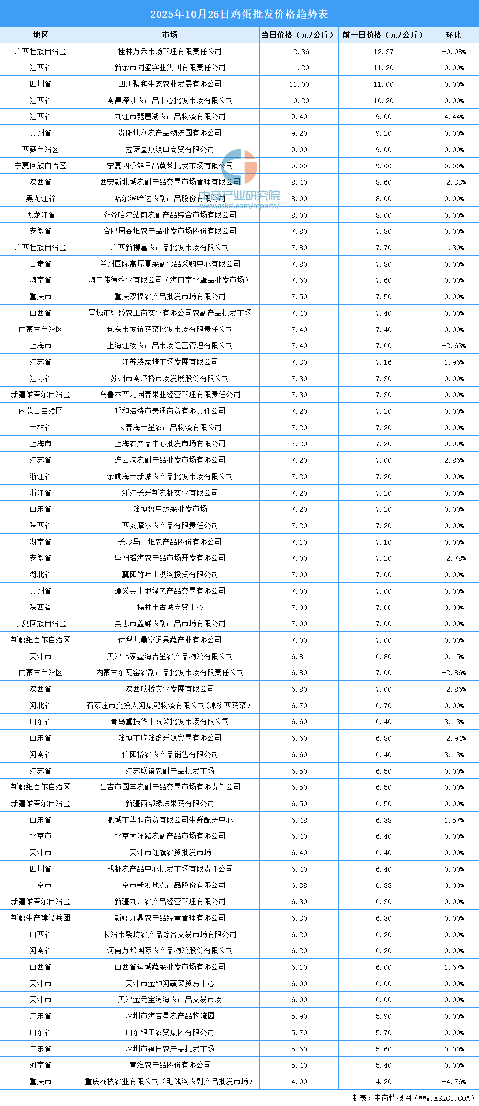 中商情報網(wǎng)訊:最新數(shù)據(jù)顯示:10月26日全國雞蛋平均價格為7.24元/公斤。其中,雞蛋價格最高的市場是桂林萬禾市場管理有限責(zé)任公司,當日價格為12.36元/公斤,環(huán)比下跌0.08%。雞蛋價格最低的市場是重慶花枝農(nóng)業(yè)有限公司(毛線溝農(nóng)副產(chǎn)品批發(fā)市場),當日價格為4.00元/公斤,環(huán)比下跌4.76%。