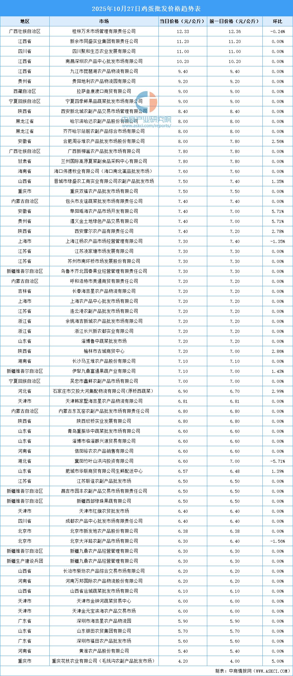 中商情報網訊:最新數據顯示:10月27日全國雞蛋平均價格為7.26元/公斤。其中,雞蛋價格最高的市場是桂林萬禾市場管理有限責任公司,當日價格為12.33元/公斤,環(huán)比下跌0.24%。雞蛋價格最低的市場是重慶花枝農業(yè)有限公司(毛線溝農副產品批發(fā)市場),當日價格為4.20元/公斤,環(huán)比上漲5.00%。