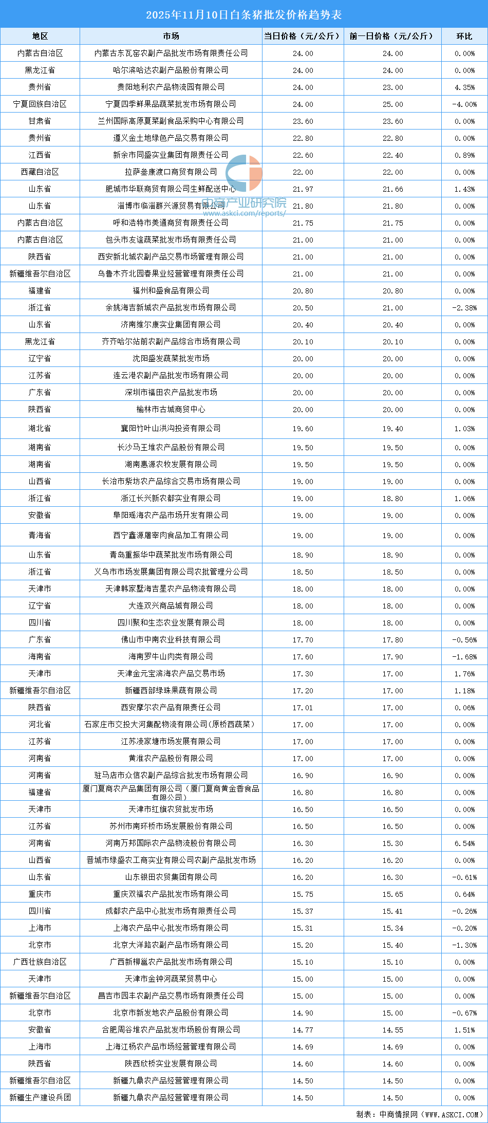 中商情報(bào)網(wǎng)訊:最新數(shù)據(jù)顯示:11月10日全國(guó)白條豬平均價(jià)格為18.57元/公斤。其中,白條豬價(jià)格最高的市場(chǎng)是內(nèi)蒙古東瓦窯農(nóng)副產(chǎn)品批發(fā)市場(chǎng)有限責(zé)任公司、哈爾濱哈達(dá)農(nóng)副產(chǎn)品股份有限公司、貴陽(yáng)地利農(nóng)產(chǎn)品物流園有限公司、寧夏四季鮮果品蔬菜批發(fā)市場(chǎng)有限公司,當(dāng)日價(jià)格均為24.00元/公斤。白條豬價(jià)格最低的是新疆九鼎農(nóng)產(chǎn)品經(jīng)營(yíng)管理有限公司,當(dāng)日價(jià)格為14.50元/公斤,環(huán)比持平。